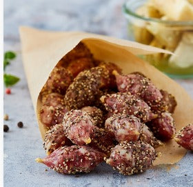 Svinekød og svinefedt 85,8%, peber 9,9%, salt, LAKTOSE, dextrose, sucrose,